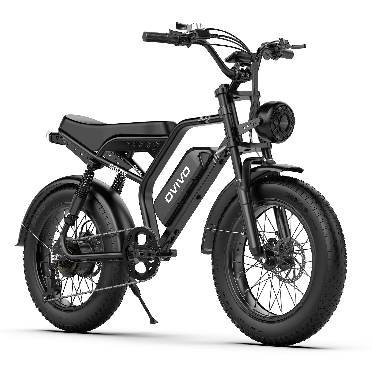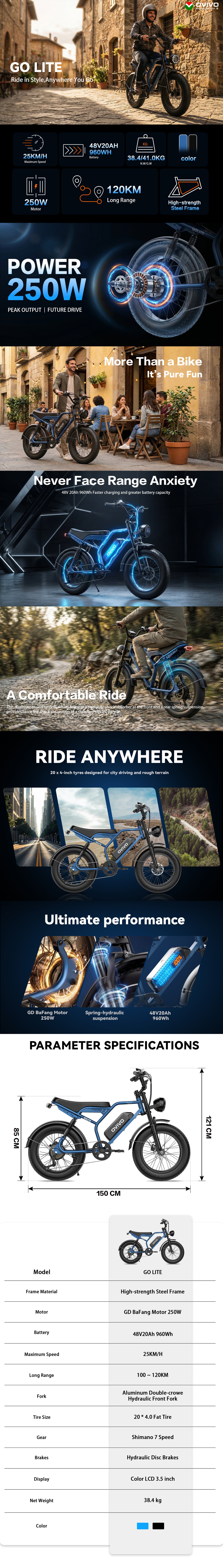 OVIVO HYPER GO Elektrofahrrad – 250-W-Motor, 48-V-20-Ah-Akku, Doppelfederung, 20x4,0"-Fatbike-Reifen und hydraulische Bremsen. Entwickelt für komfortables Fahren in der Stadt und im Gelände.