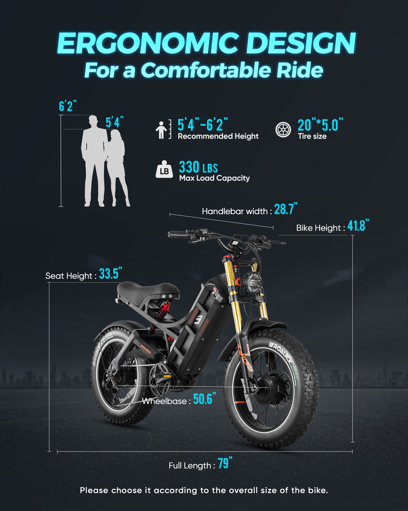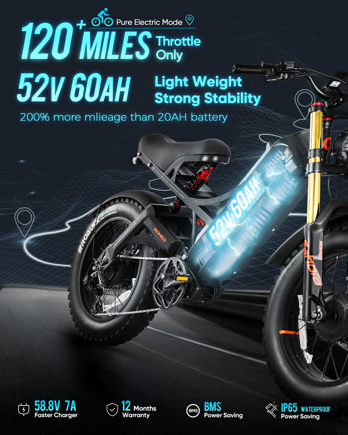 Eahora Romeo II electric bike, 52V 60Ah battery, 1250W*2 dual motors, 100Nm*2 torque, range > 120km, max speed 70km/h, max load capacity 150kg, suspension: air and oil front fork, rare shock absorber, 20"*4.5" rims