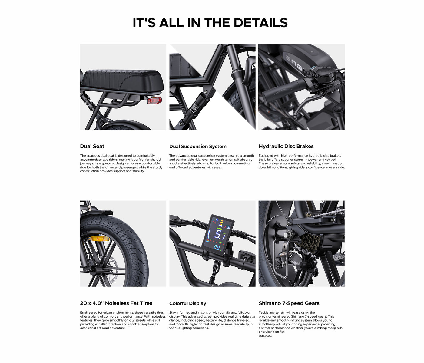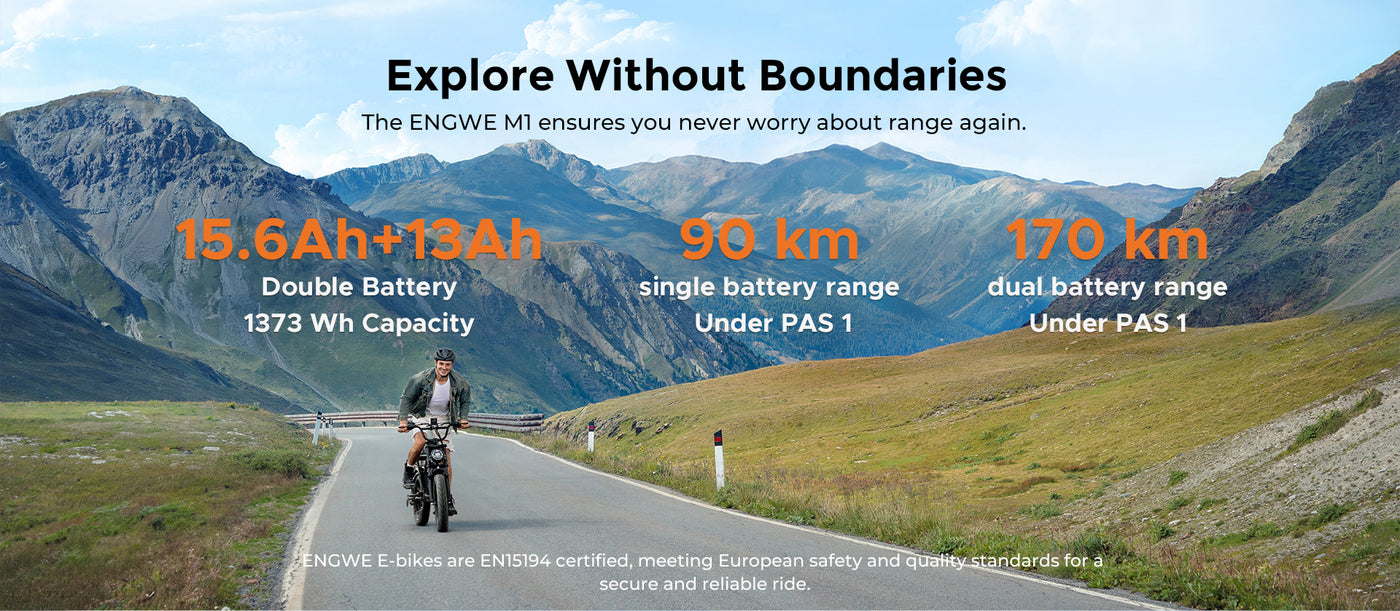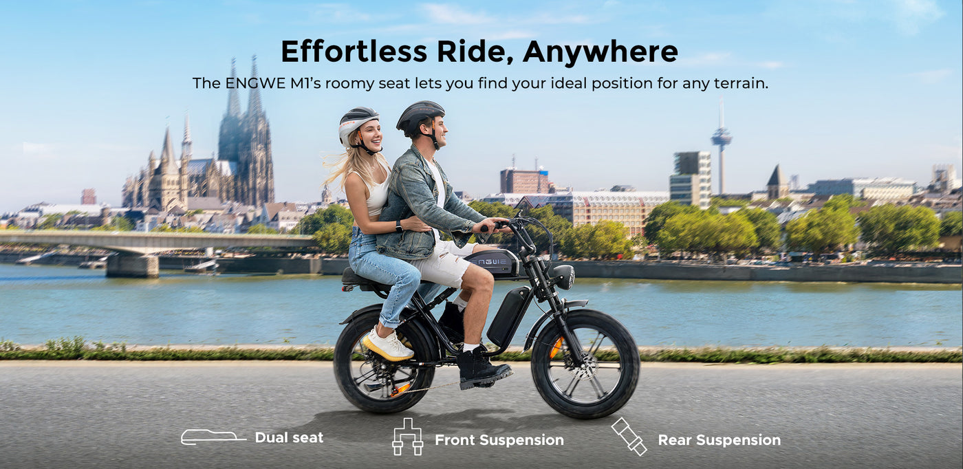 ENGWE M1 Electric Bike – 250W brushless motor, 65Nm torque, dual battery, 170KM range, double suspension & 20x4.0 fat tires. A motorcycle-styled EU-legal e-bike.