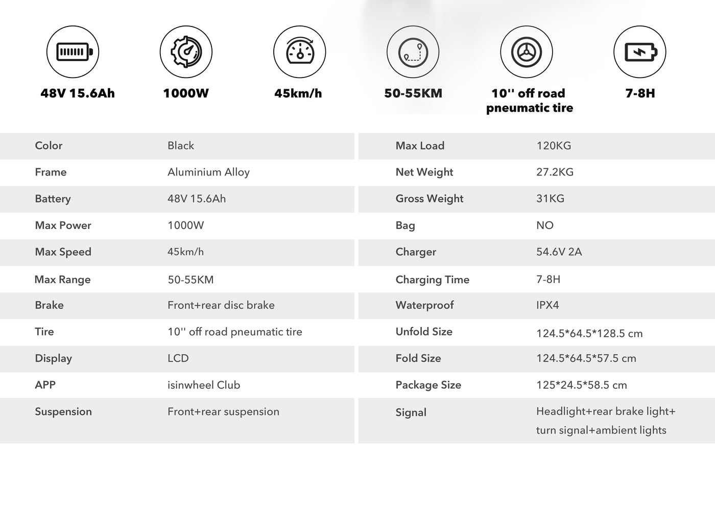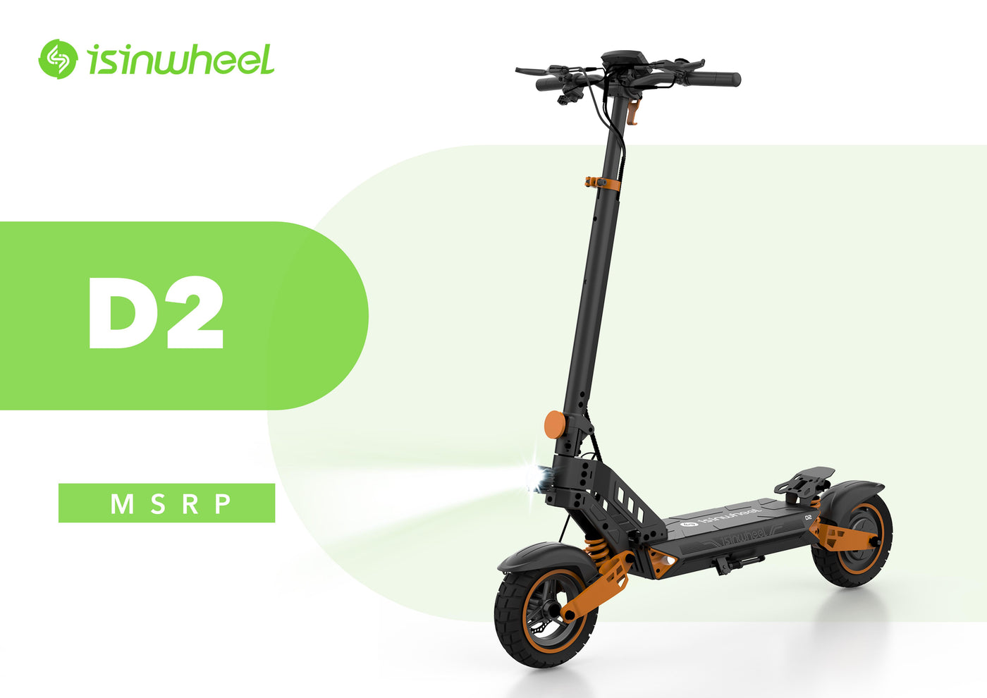 Isinwheel D2 Electric Scooter – 1000W motor, 48V 15.6Ah battery, 55KM range, 45KM/H top speed & 10” off-road tires. Built for strong performance and smooth rides.