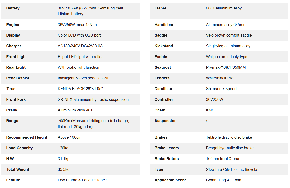 36V 18.2Ah Samsung BatteryThe Commuter “Step Thru” city electric bike uses a new Samsung lithium-ion battery with a voltage of 36 V and a capacity of 18.2 Ah, which guarantees a longer cell life and a greater range. The travel distance on one battery charge in driving assistance mode is up to 90 km.