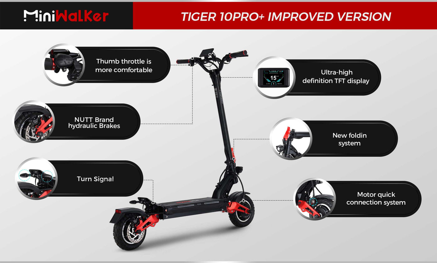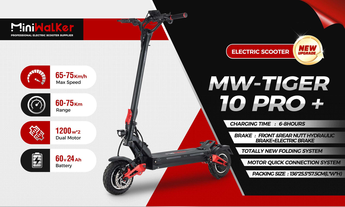Miniwalker Tiger 10 Pro+ Electric Scooter 1200W*2 Motor 75Km/h Max Speed 75KM Range