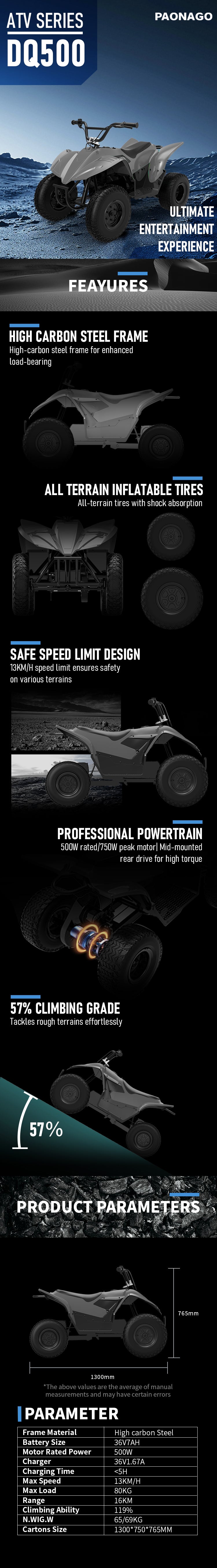 PAONAGO TC-DQ500 is a high-performance kids’ electric motorcycle equipped with a 500W motor, 13KM/H top speed, 36V 7Ah battery, and 80KG load capacity. Built with a strong high-carbon steel frame, it offers a stable, powerful, and exciting riding experience for young riders.