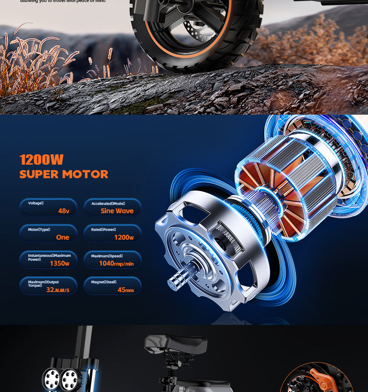 RUITOO M5 PRO Electric Scooter 1200W motor, 48V 20.8Ah battery, up to 25KM/H speed, 120KG load capacity, with seat and rear storage box. Durable & stylish.